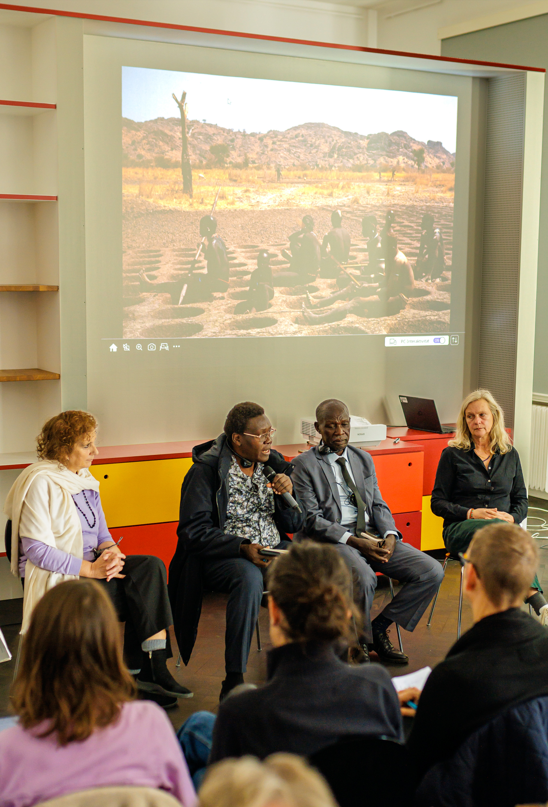 Allein die Keynote von Dr. Guma Kunda Komey Kalo vom Pan-Nuba Council machte klar: der Kontext ist wichtig und in diesem Fall ist es die verheerende politische Lage im Sudan. Abgesehen von Hunger, Bürgerkrieg und Vertreibung muss die ethnische Gruppe der Nuba gegen Ausgrenzung und Marginalisierung. kämpfen. Das Kollaborationsprojekt zu den Riefenstahl-Fotos sei ein Mehrwert in diesem Kampf der Nuba, da es diese als Akteur*innen und Besitzende der eigenen Geschichte und Gegenwart anerkenne. Das Projekt sei ein Meilenstein im Kampf der Nuba um ein kollektives Gefühl von Einheit, Zugehörigkeit und einem würdigen gesellschaftspolitischen Schicksal, so Guma weiter.