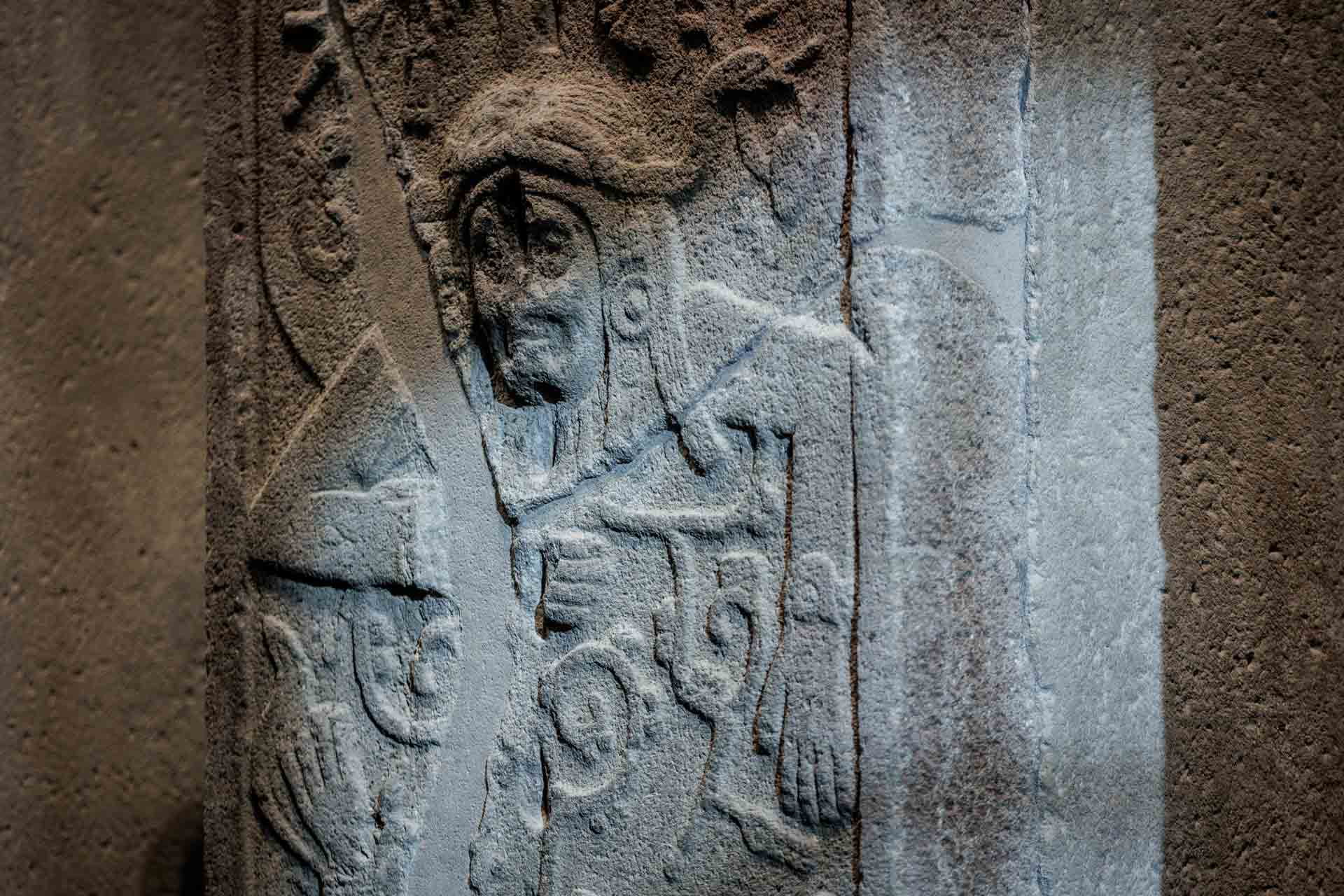 Aber es ist natürlich nicht nur die wunderbare Raumatmosphäre, die Besucher*innen so einnimmt. Es sind vor allem die Reliefs selbst, die einem zum Staunen bringen, und die Geschichten, die sie erzählen, Geschichten von der sehr eigenständigen Cotzumalhuapa-Kultur an der Pazifikküste Guatemalas, die ihre Blüte zwischen 650 und 950 nach der Zeitenwende hatte und die sich von der benachbarten Maya-Kultur stark unterscheidet. Bis heute wirft sie viele Forschungsfragen auf: Was genau machte diese Regionalkultur aus? Welche Sprache haben die Menschen gesprochen? Was genau bedeutet ihre Schrift, denn nur rund dreißig Zeichen sind bekannt, konnten aber bisher nicht entziffert werden. Klar ist: Die Reliefs der Stelen zeigen Menschen, die sich mit ihren Ahn*innen, mit Gottheiten austauschen, ihnen Opfer bringen, auch Menschenopfer, und die sie um Fruchtbarkeit für eine gute Ernte bitten. Auf anderen Monumenten sind Herrscher mit ihren Insignien sind zu sehen, auch der skelettierte Totengott.